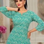 A soothing turquoise base adorned with contemporary floral prints, adding a refreshing and vibrant touch to your wardrobe. - 🧵 Fabric: